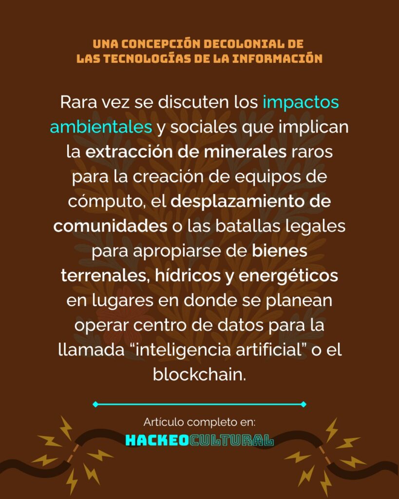 Rara vez se discuten los impactos ambientales y sociales que implican la extracción de minerales raros para la creación de equipos de cómputo [2], nicomo el desplazamiento de comunidades o las batallas legales para apropiarse de bienes terrenales, hídricos y energéticos en lugares en donde se planean operar centro de datos para la llamada “inteligencia artificial” o el blockchain [2]. Mucho menos se cuestionan las grandes promesas de mejora para la humanidad, falsedades que se utilizan para avanzar en intereses monetarios de sus creadores e inversores [3].