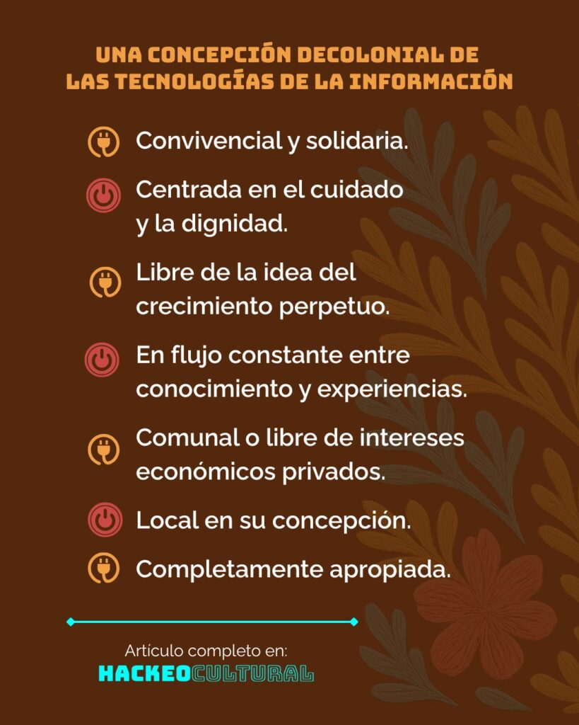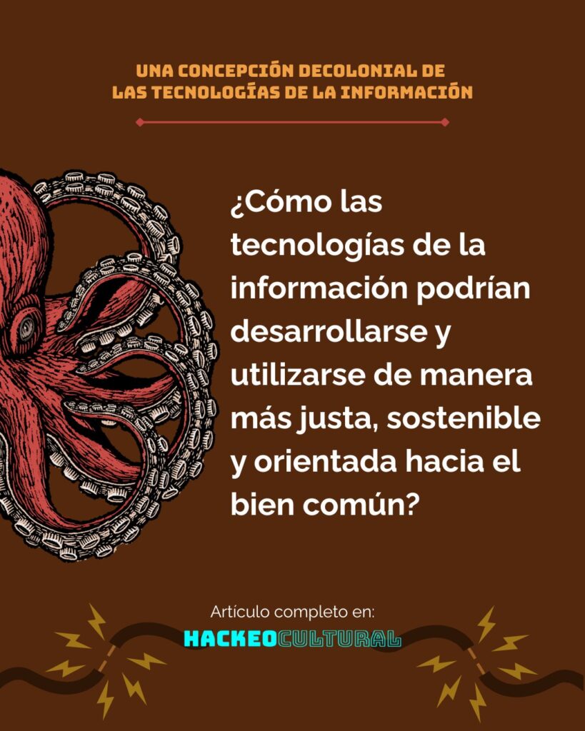 El ejercicio de creación de tecnologías decoloniales es fundamental para desmantelar las estructuras que perpetúan la desigualdad y la explotación. Al trabajar colectivamente, con respeto, dignidad y apoyo mutuo, no solo podemos desarrollar herramientas que aborden los problemas actuales, sino también trazar un camino hacia un futuro más justo, donde la tecnología sirva a la humanidad y no a los intereses privados y hegemónicos.A menudo se dice que “es más fácil imaginar el fin del mundo que el fin del capitalismo” y cada vez que escucho esta frase me provoca un malestar profundo. Detrás de este ejercicio está la convicción de que debemos imaginar otro futuro para hacerlo posible. Un futuro donde habitemos el mundo que nos merecemos y necesitamos: libre de colonialismo, capitalismo y patriarcado.